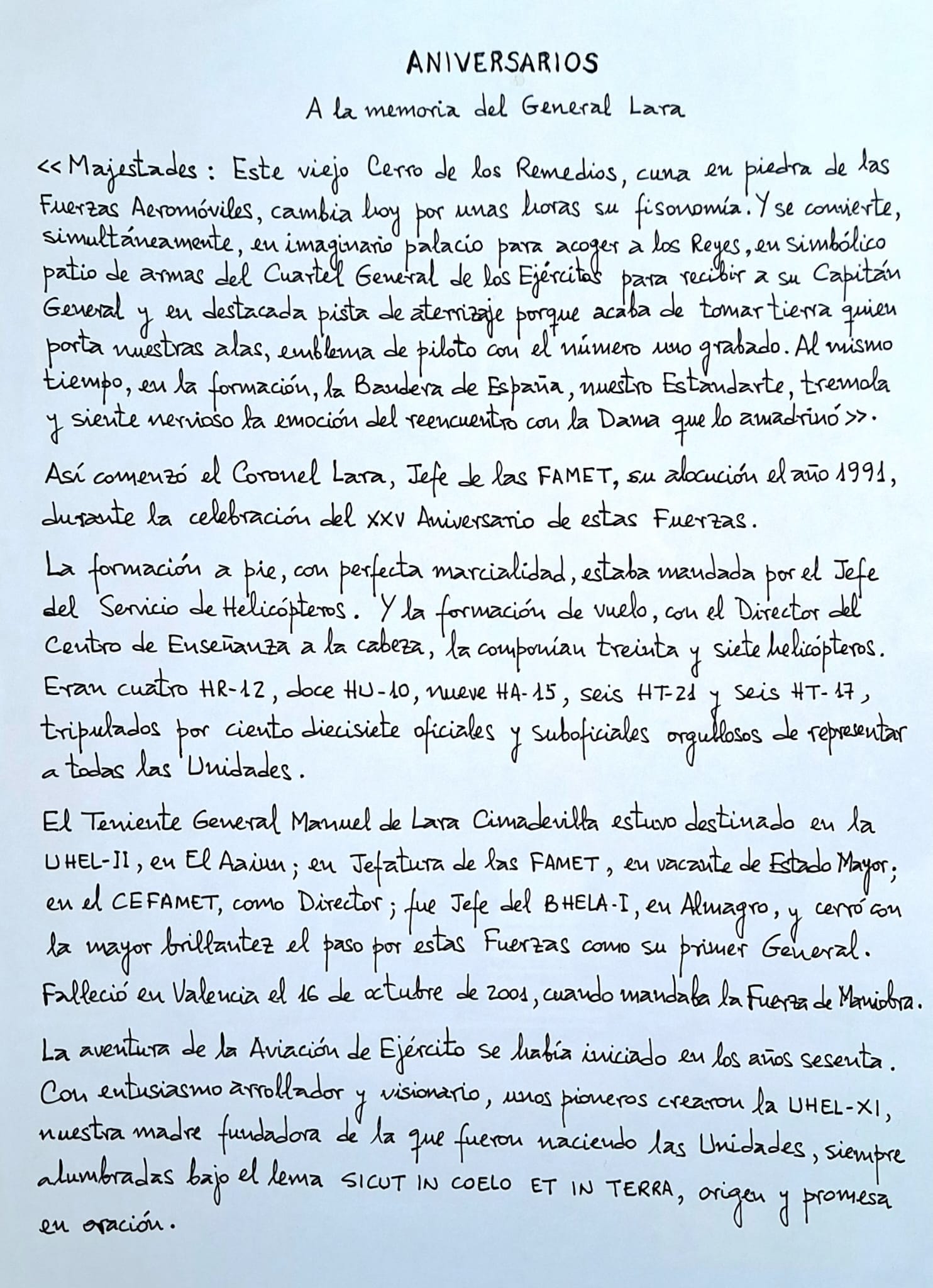 Cuando se han cumplido veinticuatro años del fallecimiento del TG Lara, el Coronel D. Miguel Simón Picapeo nos envió algunas fotos, con un recuerdo que escribió hace tiempo.