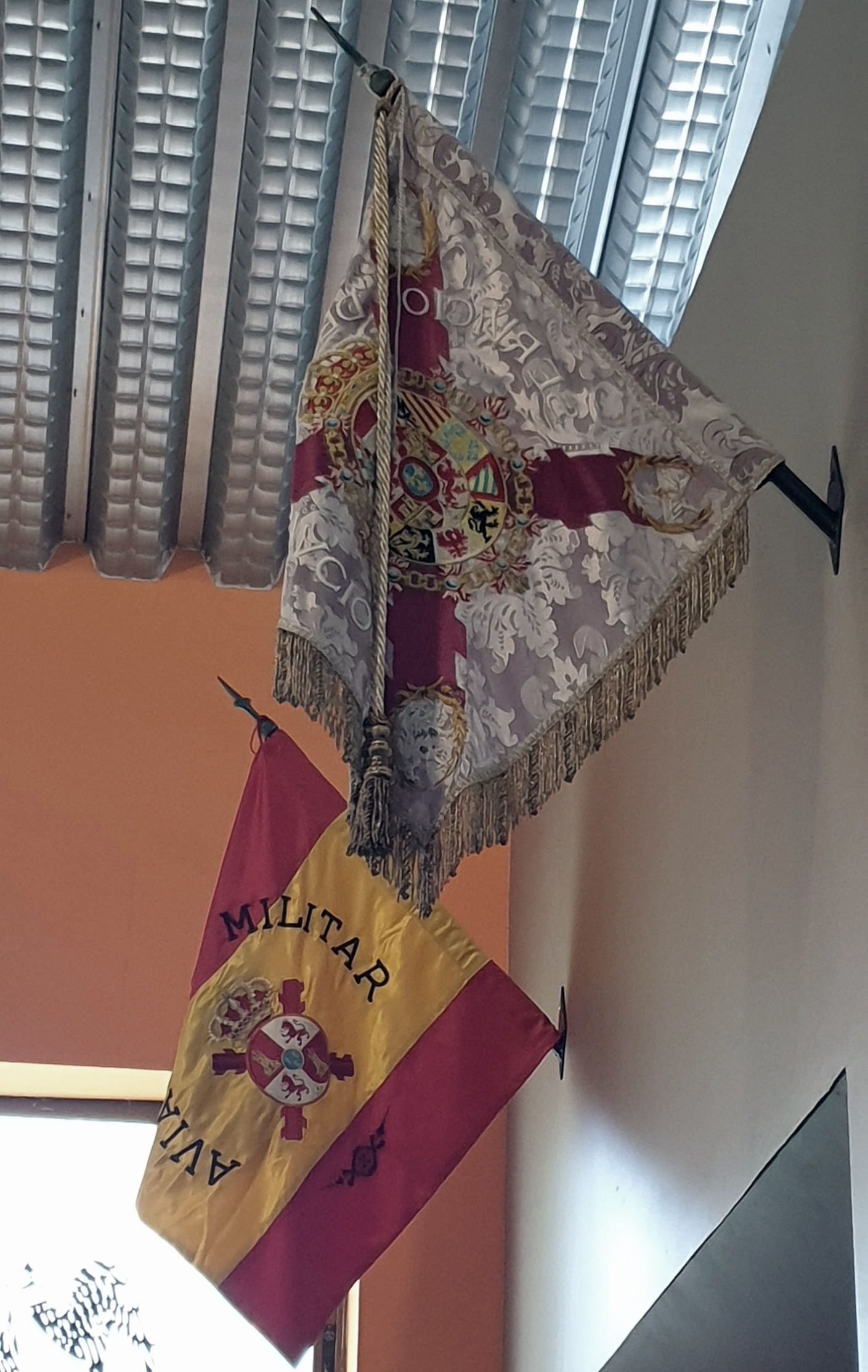 A la entrada, a la derecha, nos encontramos un mono y cazadora de vuelo de S.M. el Rey Felipe VI cuando era comandante, y los cascos de vuelo suyo y de su padre, el Rey Juan Carlos I, y distintas visitas de ambos monarcas. Encima se pueden observar copia del estandarte y la bandera que concedieron al Servicio de Aerostación y al de Aviación, respectivamente, y que fue entregado en 1923, siendo madrina la reina Victoria Eugenia. Podemos ver como la reina Sofía fue la madrina de la entrega del estandarte a la FAMET, en 1981, y como la reina Leticia hace entrega del estandarte a la Academia de Aviación del Ejército de Tierra. Cerrando el estrecho círculo que siempre ha existido entre la familia real y la Aviación del Ejército de Tierra.
